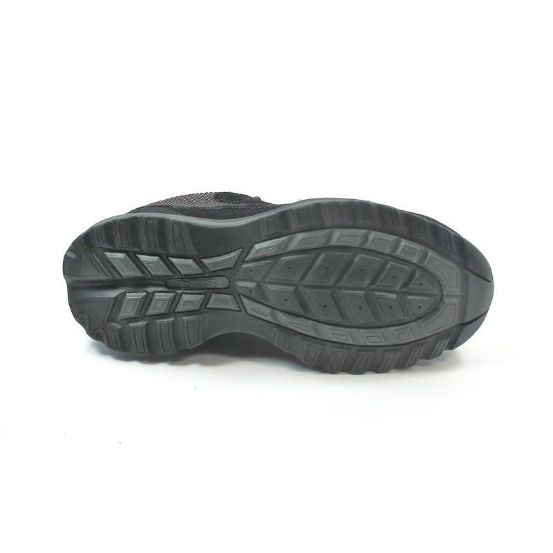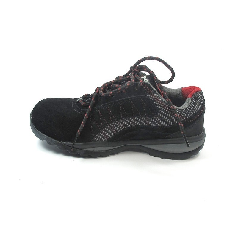 Cette chaussure de sécurité très légère pour homme de style tennis de sécurité en cuir croûte velours noir / toile grise, doublure textile, présente diverses caractéristiques :