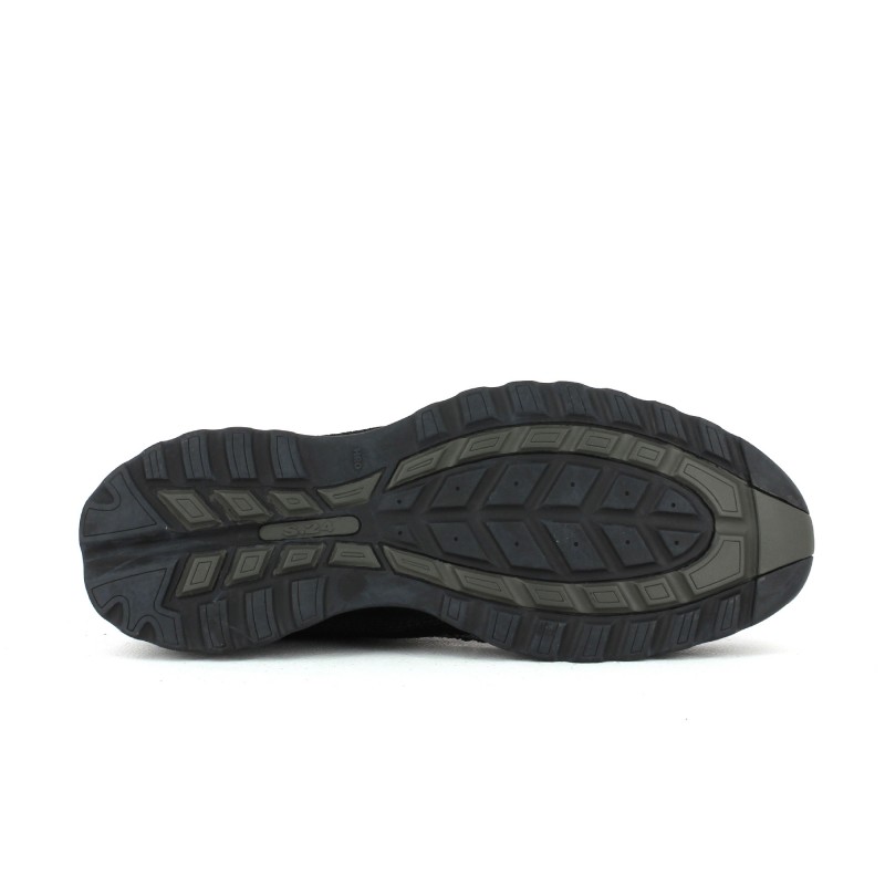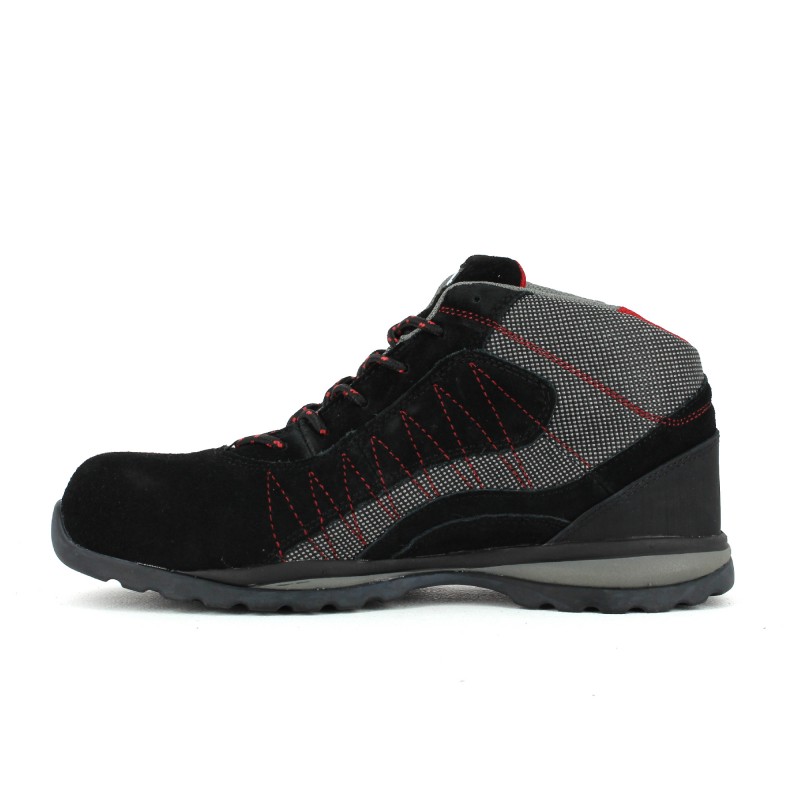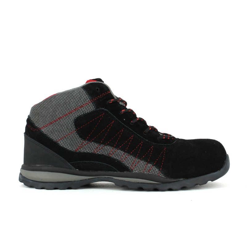 Cette chaussure de sécurité montante type basket de sécurité mixte est en cuir croûte velours noir / toile grise avec doublure textile. Elle dispose de diverses caractéristiques :
