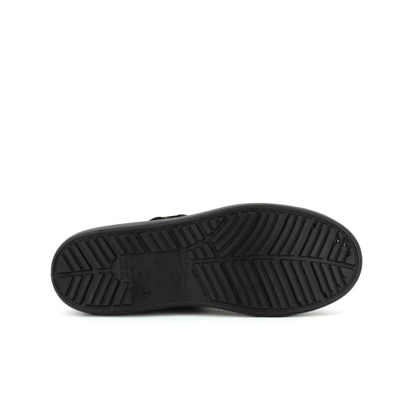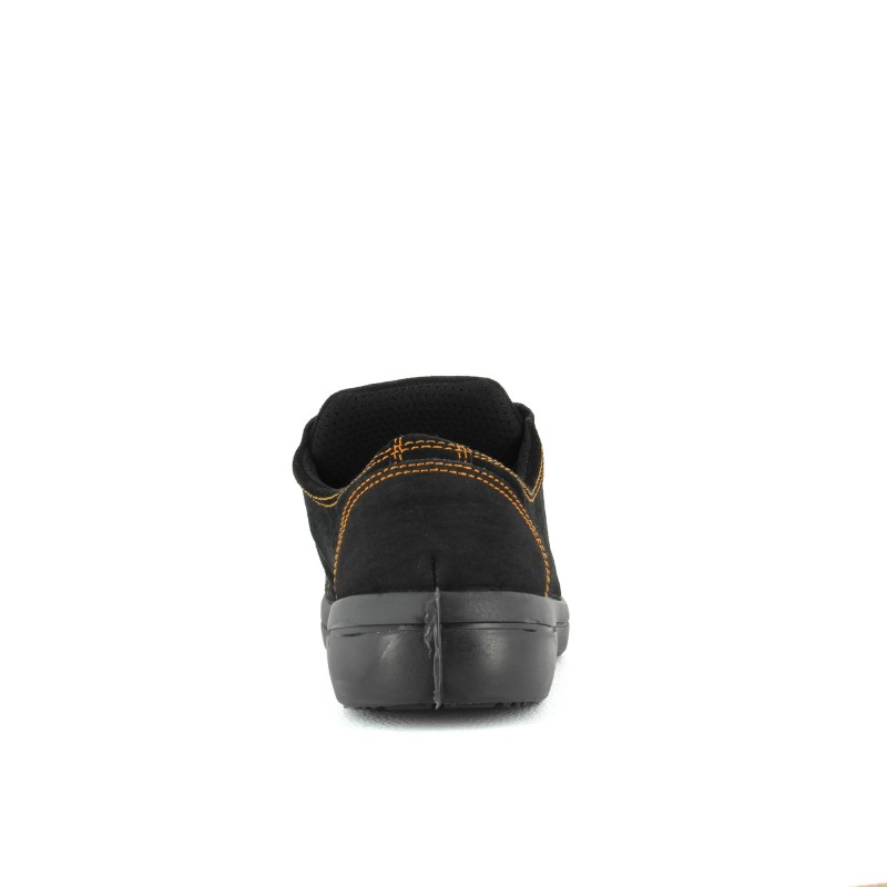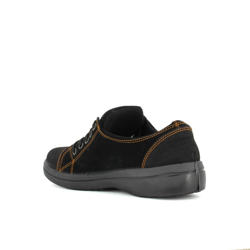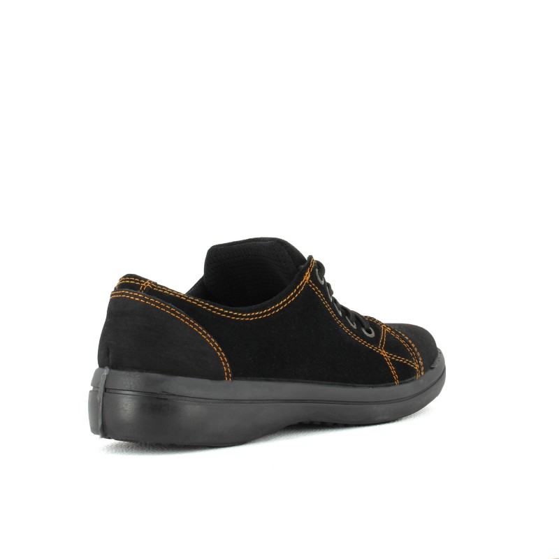 Cette tennis de sécurité basse est très féminine en matière velours hydrofuge de couleur noir, très confortable et résistante, avec surpiqures contrastées.