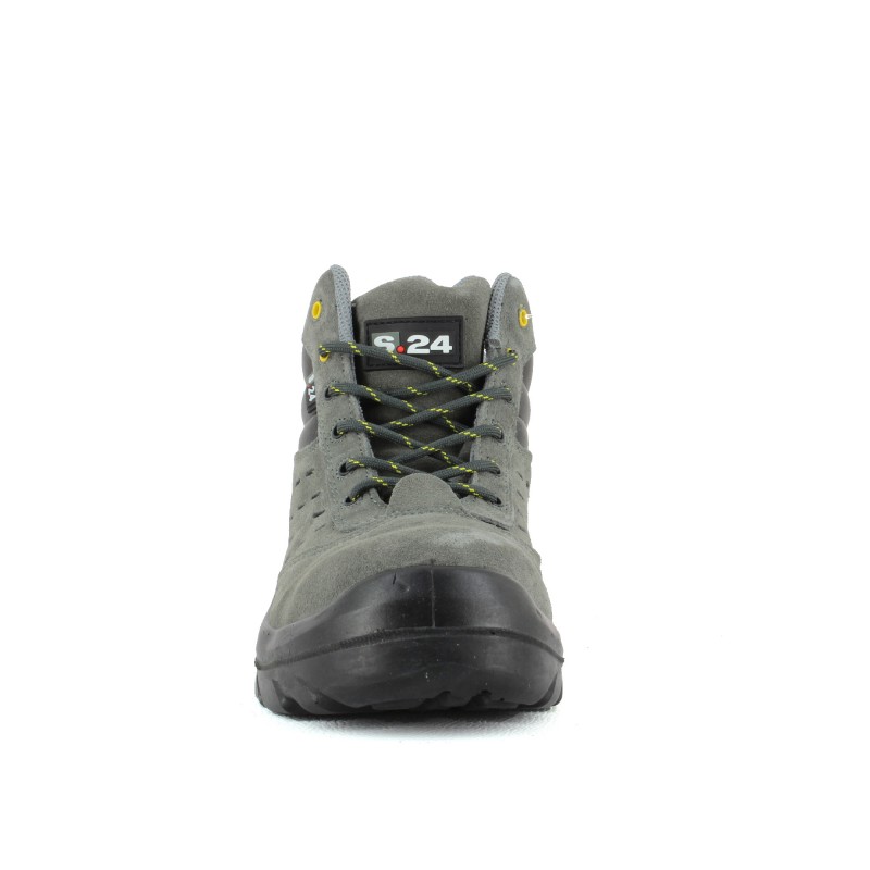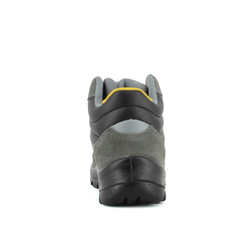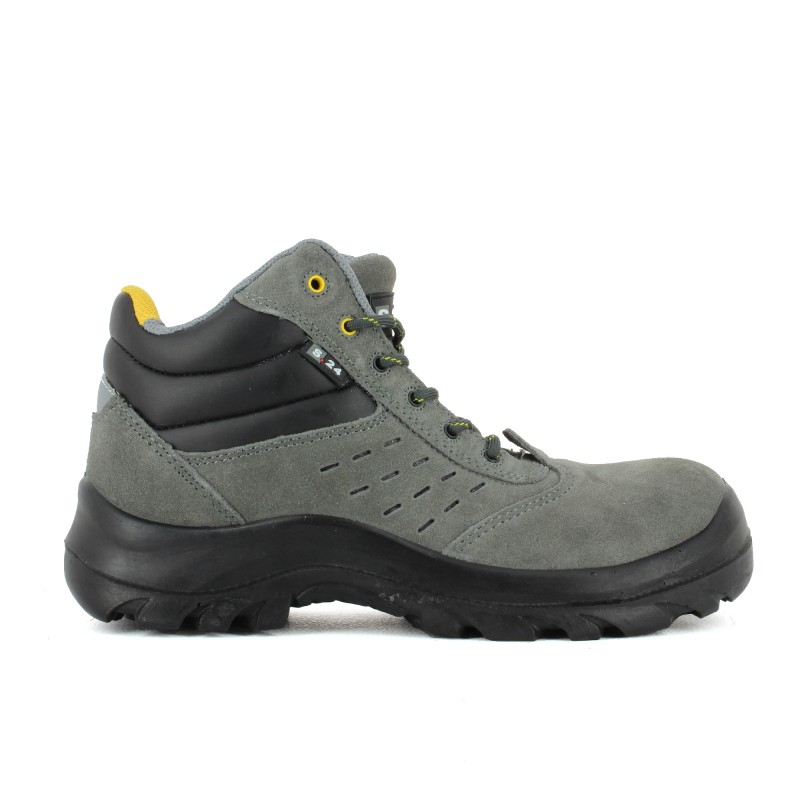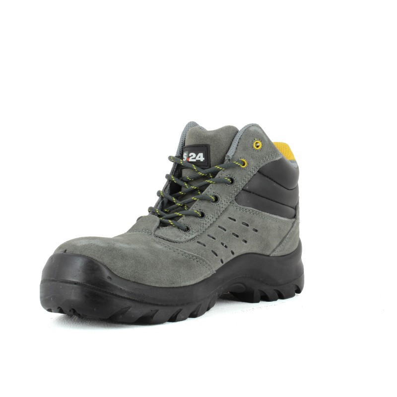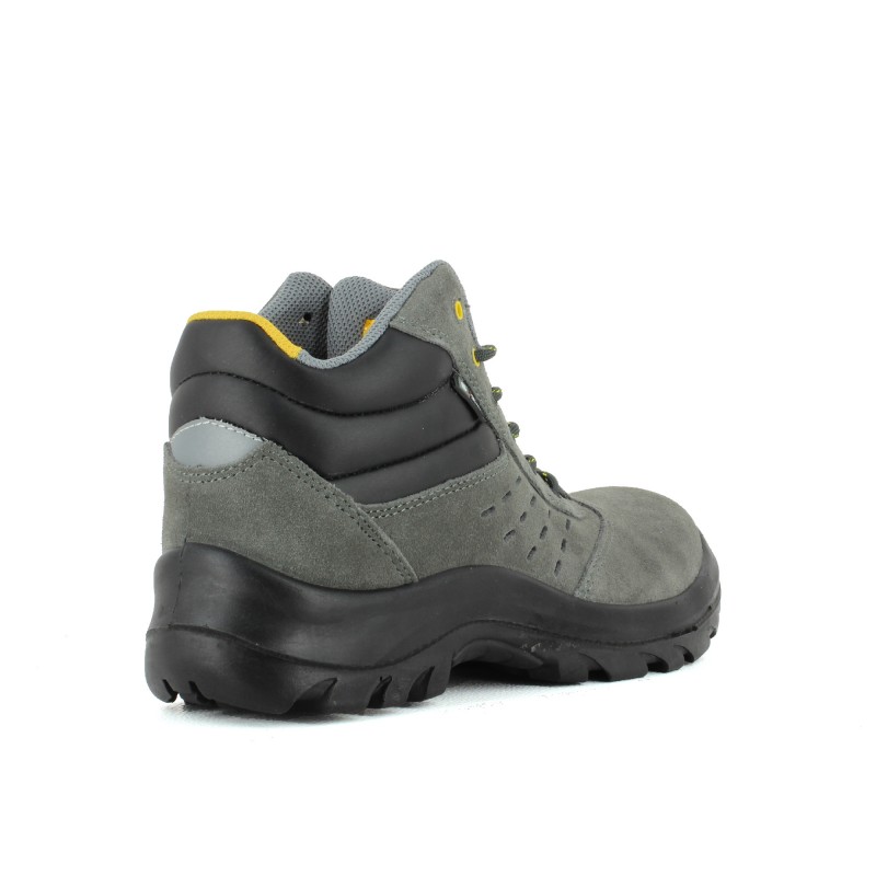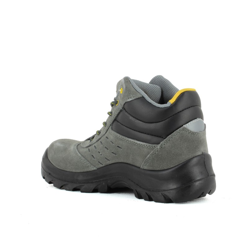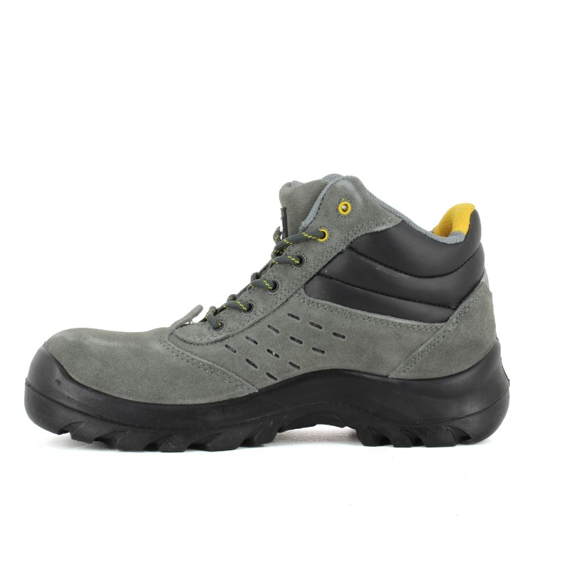 Chaussure de sécurité montante très souple en cuir croûte velours perforé gris avec semelle anti-perforation en composite garantissant légèreté, isolation thermique et couverture à 100% de la plante du pied.
